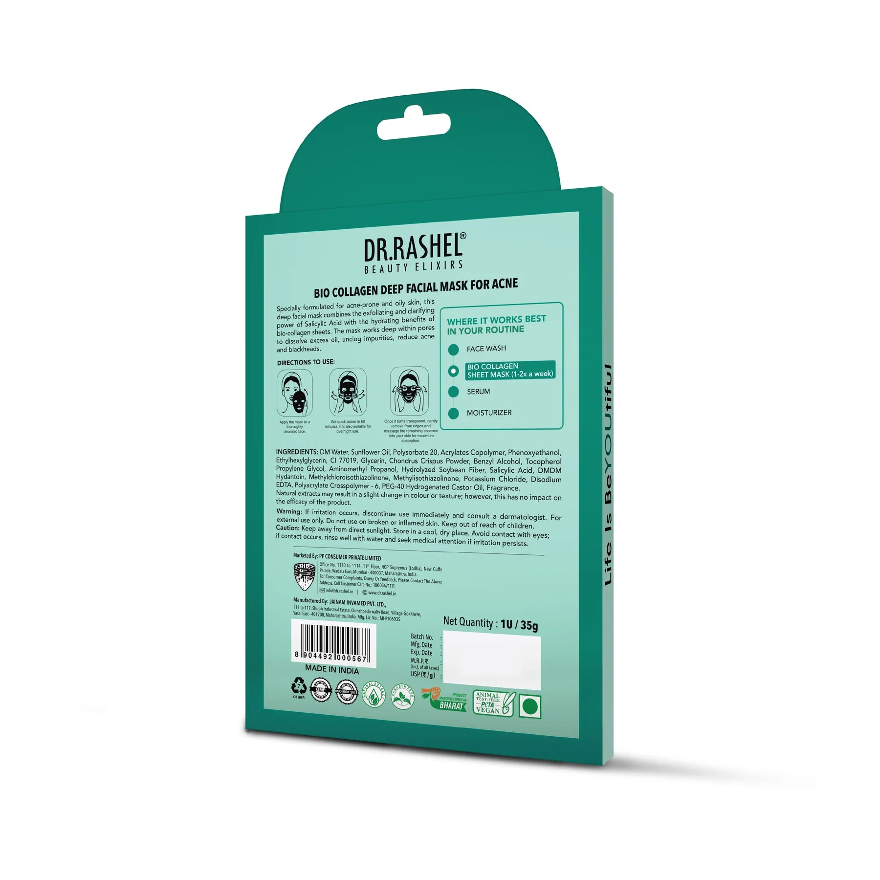 Salicylic acid is a beta hydroxy acid (BHA) derived from willow bark and is a gold-standard ingredient for acne care. Unlike water-soluble acids, salicylic acid is oil-soluble, allowing it to penetrate deep into pores and break down sebum and dead cells. This makes it highly effective in preventing acne and clearing blackheads. When paired with bio-collagen, the formula addresses not only breakouts but also signs of aging, as collagen supports elasticity and reduces fine lines. Hyaluronic acid in the mask ensures the skin stays hydrated, while aloe vera and vitamin E soothe and protect. This combination makes the mask a dual-action solution that clarifies acne-prone skin while simultaneously firming and rejuvenating for a smoother, healthier complexion.