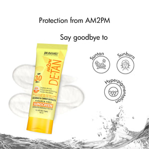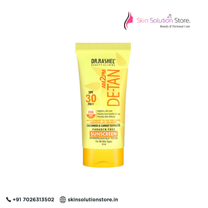 Dr. Rashel De-Tan Sunscreen SPF 30 is a daily protective formula designed to shield your skin from harmful UVA and UVB rays while reducing tanning and brightening the complexion. With broad-spectrum SPF 30, it provides effective sun protection that prevents sunburn, pigmentation, and premature aging caused by sun exposure. Enriched with brightening and hydrating actives, it helps fade existing tan, restore skin clarity, and maintain an even tone. Its lightweight, non-greasy texture blends easily into the skin, leaving no white cast, making it suitable for all skin types. Perfect for everyday outdoor use, this sunscreen not only protects but also works as a brightening care solution to keep your skin safe, fresh, and glowing.
