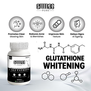 Emmas Pure L-Glutathione Skin Lightening Capsules are an advanced skin-brightening supplement formulated to target dark spots, pigmentation, and uneven skin tone from within. This scientifically balanced blend of L-Glutathione, Vitamin C, and Collagen helps detoxify your body, repair damaged cells, and reveal naturally glowing skin. Designed for both men and women, this formula not only improves fairness and radiance but also supports overall skin health by boosting elasticity and reducing signs of aging. With consistent use, it visibly lightens dark areas, smoothens texture, and enhances your natural complexion — the safe, effective, and long-term route to flawless, radiant skin.
