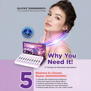 Glutax 20000000GN+ Recombined White Glutathione Injection is a premium whitening and rejuvenation treatment designed for individuals seeking long-lasting results in skin fairness and anti-aging care. With its ultra-high dose glutathione, enriched with vitamins, collagen, and growth factors, this advanced formula works at the cellular level to inhibit melanin production, reduce pigmentation, and restore skin radiance. Over 10 professional sessions, it delivers cumulative whitening effects while improving skin elasticity, hydration, and texture. Known globally for its potency, Glutax 20000000GN+ is ideal for those who want visible brightening, anti-aging, and youthful skin with sustained results.