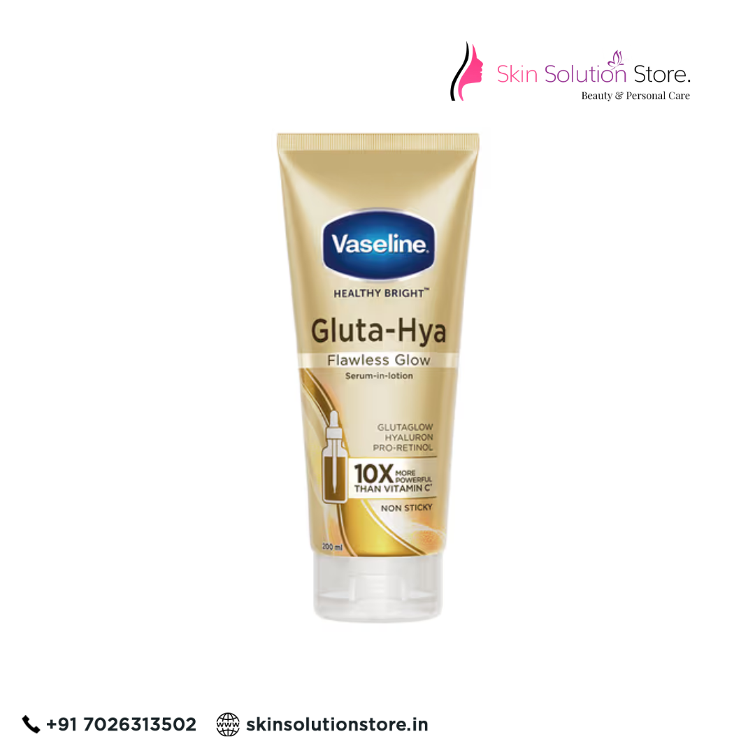 Vaseline Gluta-Hya Serum Burst Lotion – Flawless Bright is an advanced skin-brightening lotion powered by Glutathione and Hyaluronic Acid. This innovative serum-in-lotion formula bursts into hydration upon application, delivering deep nourishment while visibly brightening skin tone. Enriched with GlutaGlow technology, it is 10x more powerful than Vitamin C in reducing dullness and dark spots. Hyaluronic Acid plumps the skin with moisture, leaving it soft, radiant, and smooth. Lightweight and fast-absorbing, this lotion is perfect for daily use to achieve flawless, glowing, and even-toned skin.