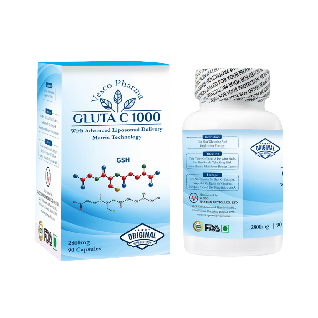 Glutathione is one of the body’s most powerful antioxidants, responsible for detoxifying cells, reducing inflammation, and protecting against premature aging. Its skin-whitening effect comes from its ability to inhibit tyrosinase — the enzyme that triggers melanin production. When combined with Vitamin C, the whitening power of glutathione increases significantly, delivering a more even, radiant complexion. Vesco Pharma Gluta C 1000 is scientifically formulated to balance this combination, ensuring faster absorption, stronger antioxidant protection, and sustained skin brightness. Continuous use also helps minimize pigmentation, repair sun damage, and maintain a youthful glow by preventing collagen breakdown.